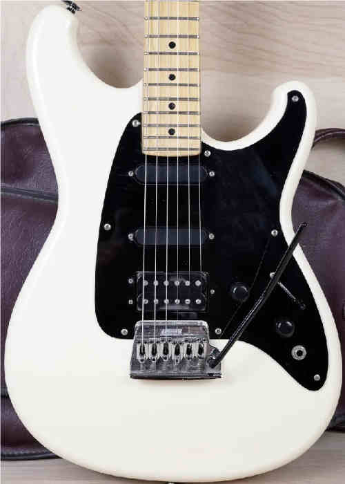 8 screw holes, 2 straight single coil & 3-screw mount humbucker pickups, 2 knobs, switch & jack, cut for small Ibanez tremolo bridge