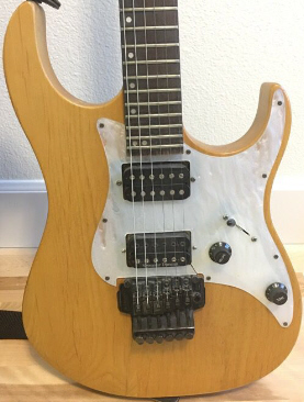 9 screw holes, 2-hole mount humbuckers at neck & bridge, 2 knobs & switch, cut for locking trem