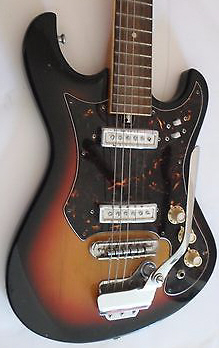 Made in Japan by Teisco company; 11 screws, 2 rectangle pickups, 3 knobs & jack, 2 slider switches